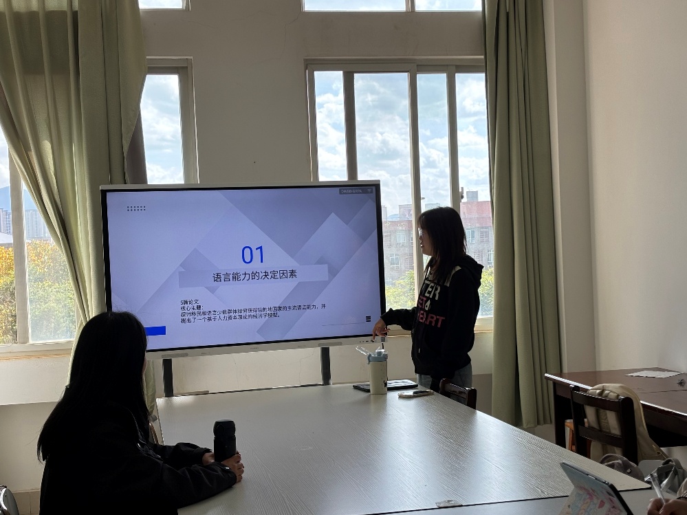 语言学专题读书会于10月29日在博文楼402举行,由2024级外国语言文学专业硕士研究生赵其梅主讲,我院杨燕教授担任嘉宾。赵其梅同学以《语言经济学:国际分析》一书为核心,系统梳理了该领域从理论建构到实证研究的主要成果,指出语言不仅是一种文化符号,更是一种具有高回报的生产性资本,经济学视角为理解语言行为提供了强有力的分析工具,而跨学科方法的融合是推动该领域发展的关键。整场汇报持续近两小时,内容翔实、讨论深入,系统呈现了语言经济学的理论框架与实证成果,也展现了同学们在跨学科研究中的思考与探索。杨燕在总结中高度评价赵其梅同学的汇报准备与现场表现,鼓励同学们在今后的研究中继续拓展视野,将理论与中国语境相结合,推动本土化研究的发展。