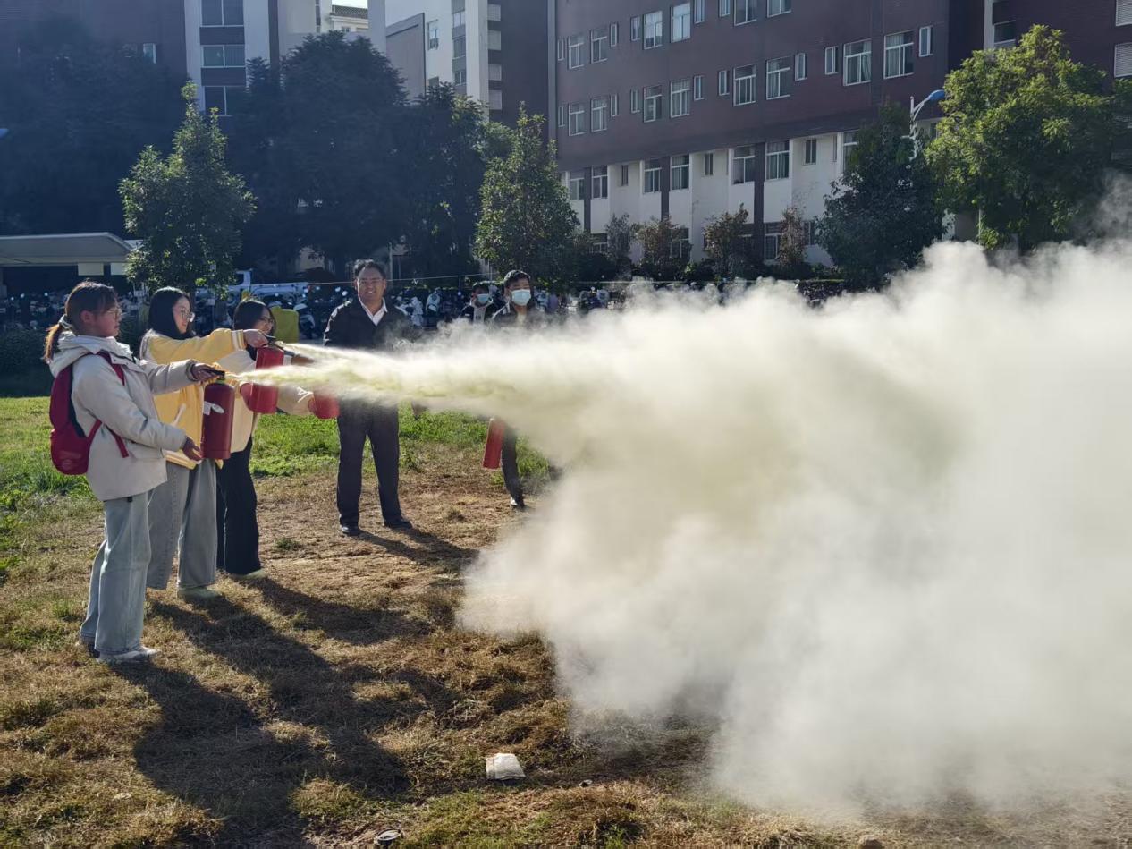 讲座结束后,开展了灭火实战演练。教员首先现场讲解灭火器的使用方法,让师生们,掌握“提、拔、握、压”等关键操作步骤。在教员指导下,安全保障员陪同下,学院师生分批进行了干粉灭火器的实际操作,亲身体验扑灭初期火灾的全过程。整个演练过程组织有序、反应迅速,达到了预期效果。