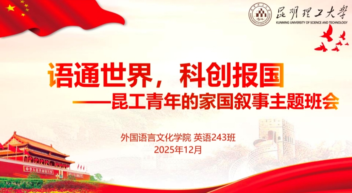 2025年12月19日,由学生工作部主办的“青春六力·筑梦中国”精品主题班会现场展示评选活动在呈贡校区管经楼D102报告厅圆满落幕。来自全校各学院的师生代表共150余人齐聚现场,共同见证优秀主题班会的风采。经过前期组织申报、学院遴选、专家评审等多轮严格筛选,外国语言文化学院243班凭借精心策划的“语通世界,科创报国——理工青年的家国叙事”主题班会脱颖而出,最终荣获“最佳风采奖”与“十佳主题班会”2项殊荣。