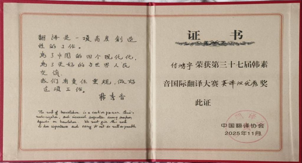 在第三十七届韩素音国际翻译大赛中,我院2023级翻译硕士付鸿宇同学凭借精准的词义把握与流畅的母语表达,荣获英译汉比赛优秀奖。韩素音国际翻译大赛作为国内历史最悠久、最具权威性的翻译赛事,被誉为中国翻译界的“奥斯卡”,竞争异常激烈。付鸿宇同学在此项顶尖赛事中获奖,充分彰显了我院学子在文学与常规文本翻译领域的深厚积淀。